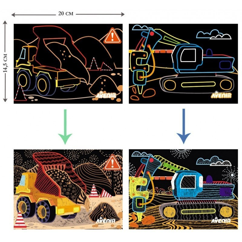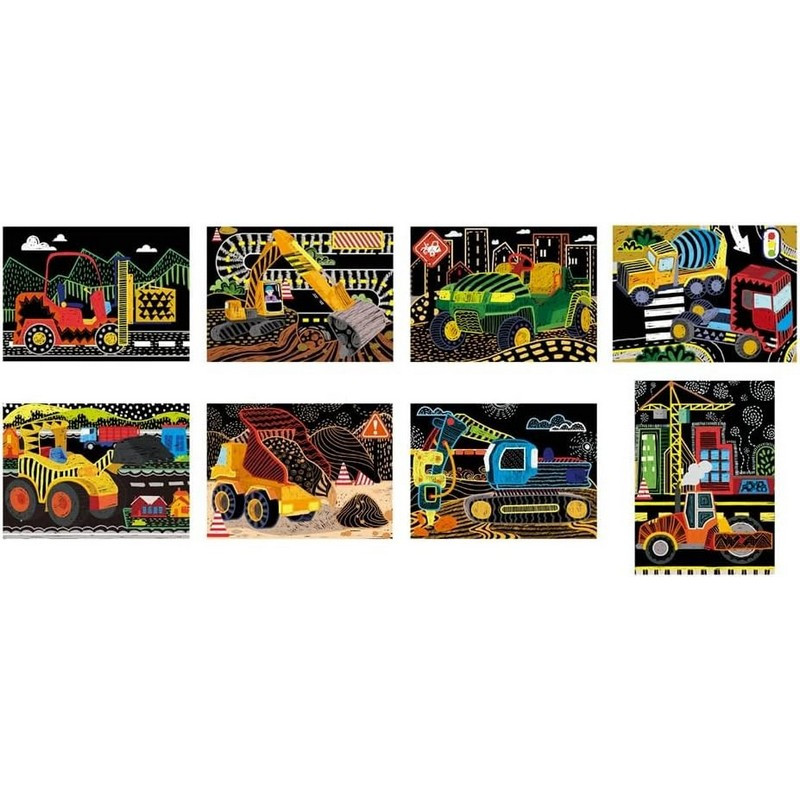 A készlet 8 különböző képet tartalmaz, amelyek mindegyike egy izgalmas építkezési jelenetet ábrázol. A fekete papírlapok felületén előre elrejtett színes minták találhatóak, amelyeket a speciális karceszköz segítségével lehet felfedni.
