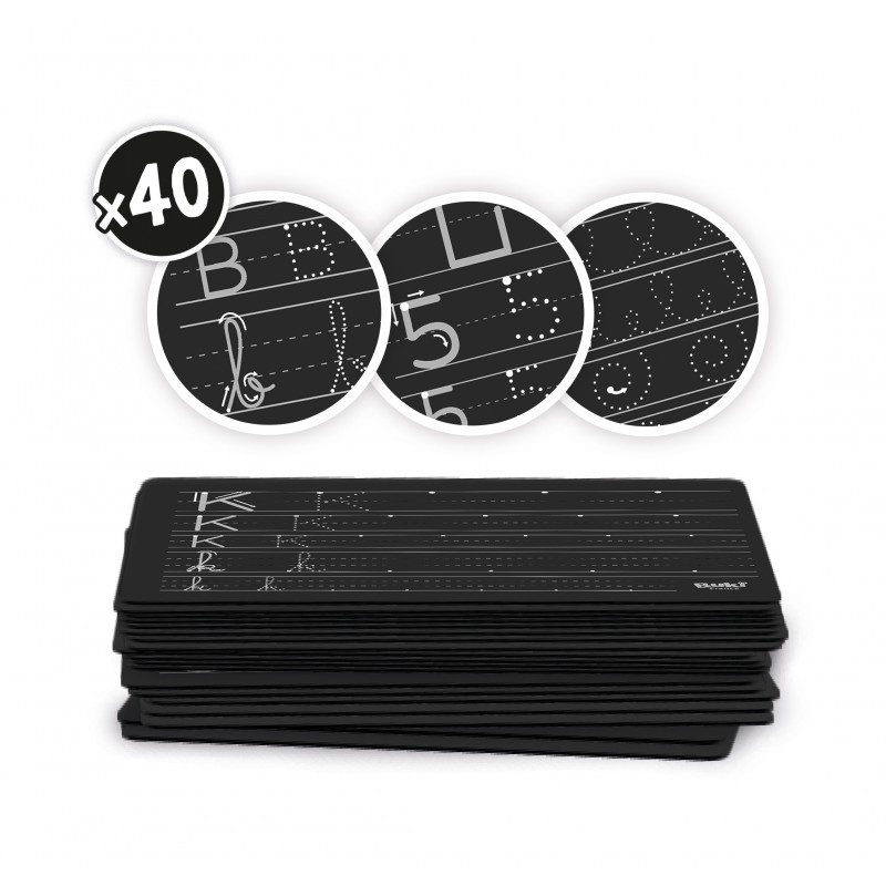A minta lapok és a tábla alá helyezhetők, így a gyerekek átmásolhatják a rajtuk lévő vonalakat, ami segíti a precíz mozdulatok elsajátítását.