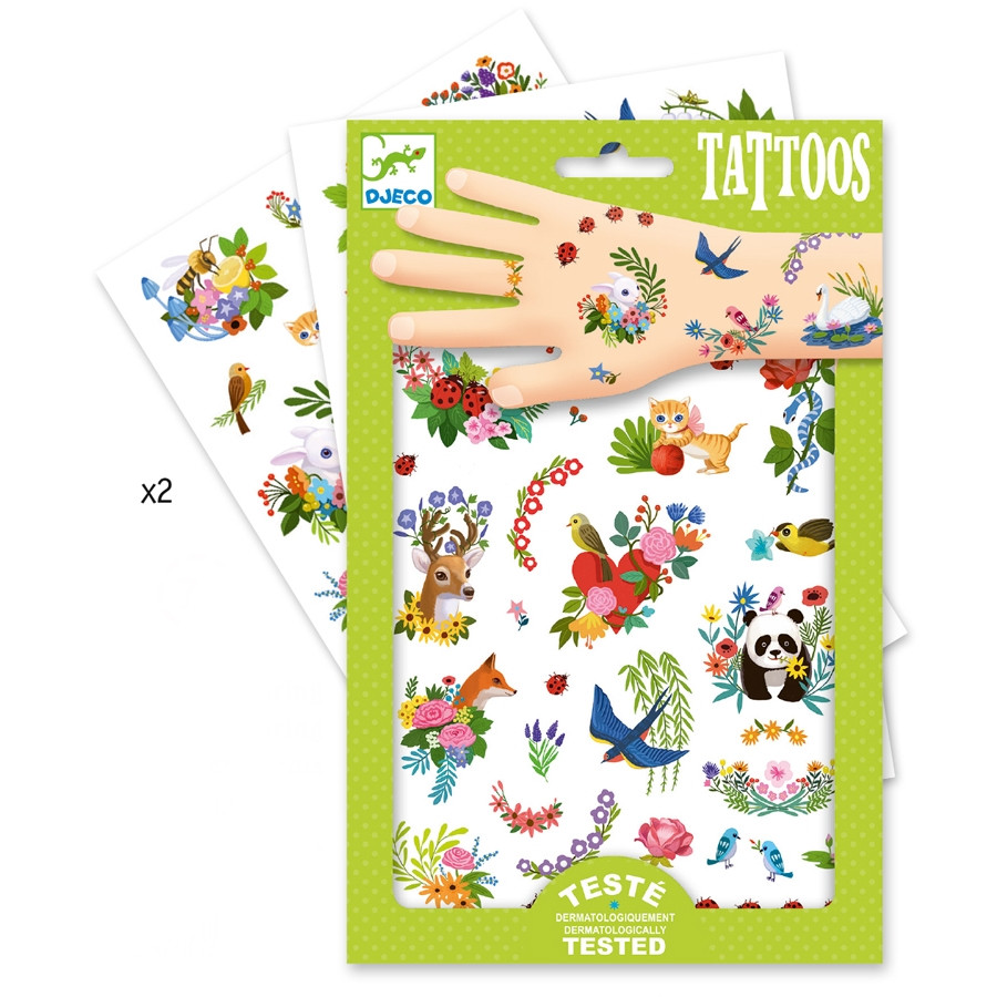 Két lap ideiglenes tetoválás gyerekeknek, gyönyörű tavaszi virágos témával. Egyszerűen és biztonságosan felhelyezhető és eltávolítható.