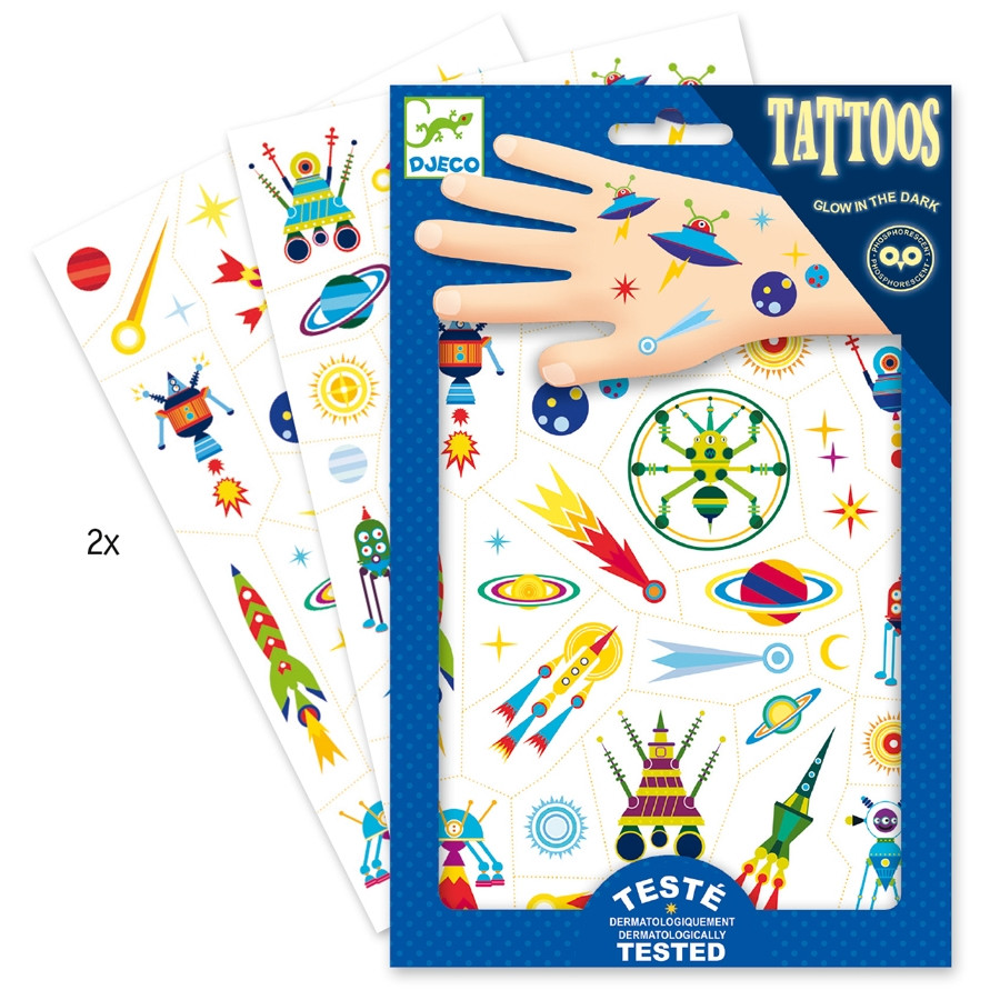 Mesés színes és sötétben világító tetoválások a Djeco-tól. A 2 ívnyi Space Oddity tetoválás számtalan rakétát, bolygót, űrhajót, robotot és üstököst tartalmaz - tökéletes kis ajándékötlet egy olyan gyermeknek, akinek bármi köze van az űrhöz, vagy aki űr témájú partit tart.