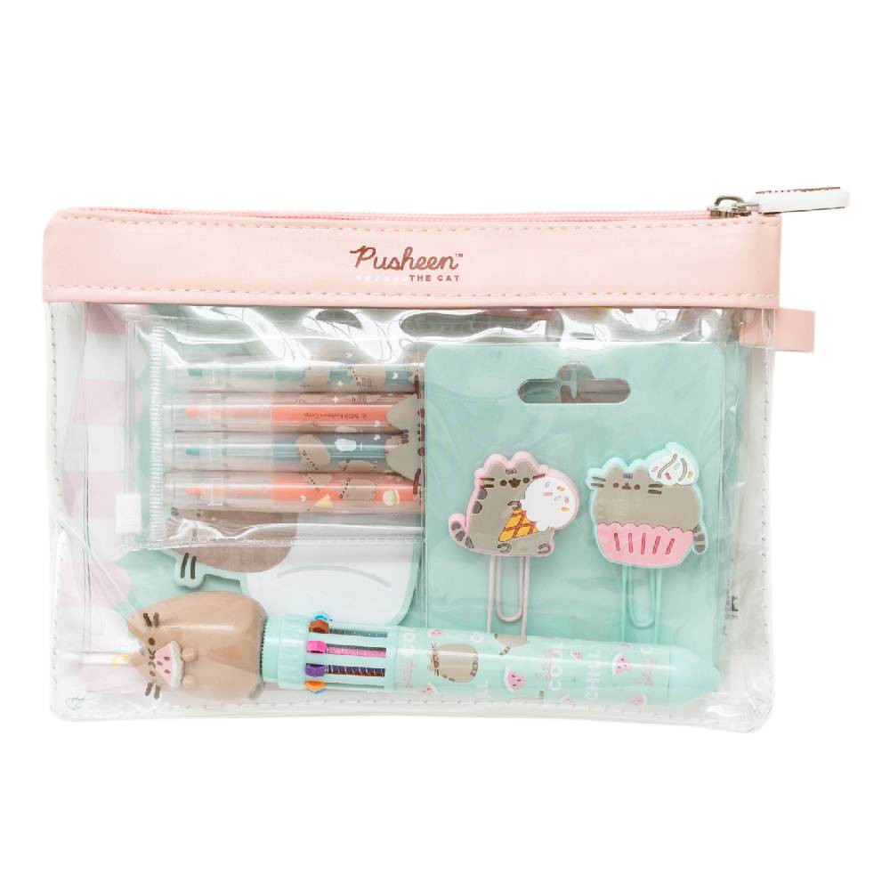 A csomag középpontjában egy különleges, 10 színű golyóstoll áll, melynek tetején egy imádnivaló 3D Pusheen figura csücsül. Ezzel a tollal egyetlen kattintással válthatsz a színek között, így a jegyzetelés és a rajzolás sosem volt még ilyen egyszerű és látványos. A fontos információk kiemeléséhez 4 darab pasztell színű szövegkiemelőt találtok egy praktikus PVC tokban, amelyek lágy árnyalataikkal teszik átláthatóvá a füzeteket.