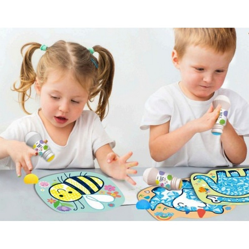 A készletben található 12 db kép különböző aranyos mintákat rejt, amelyek színes, pontozó mozdulatokkal kelnek életre.