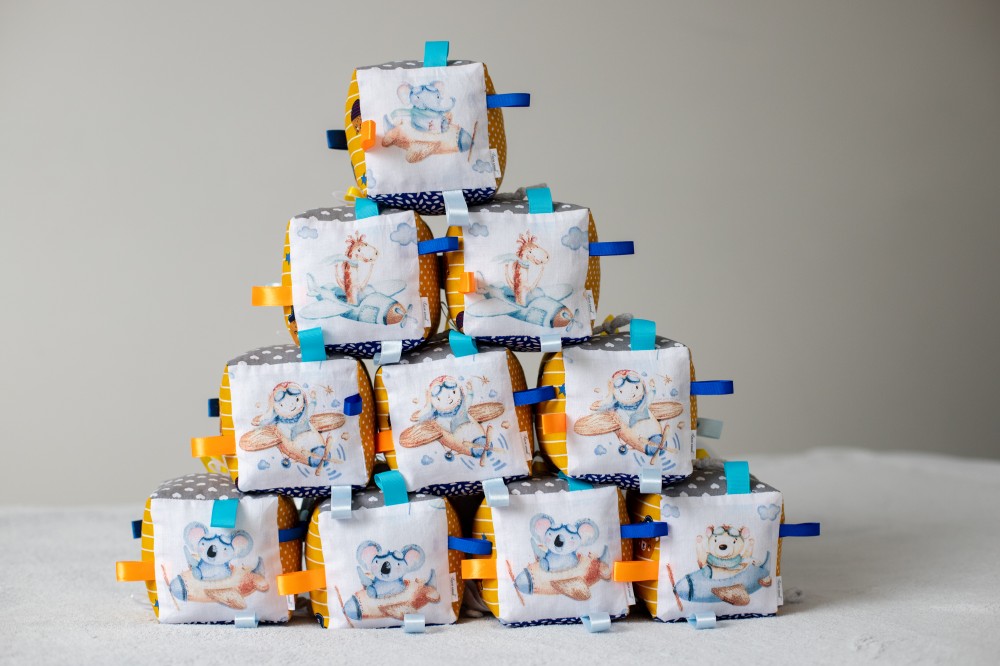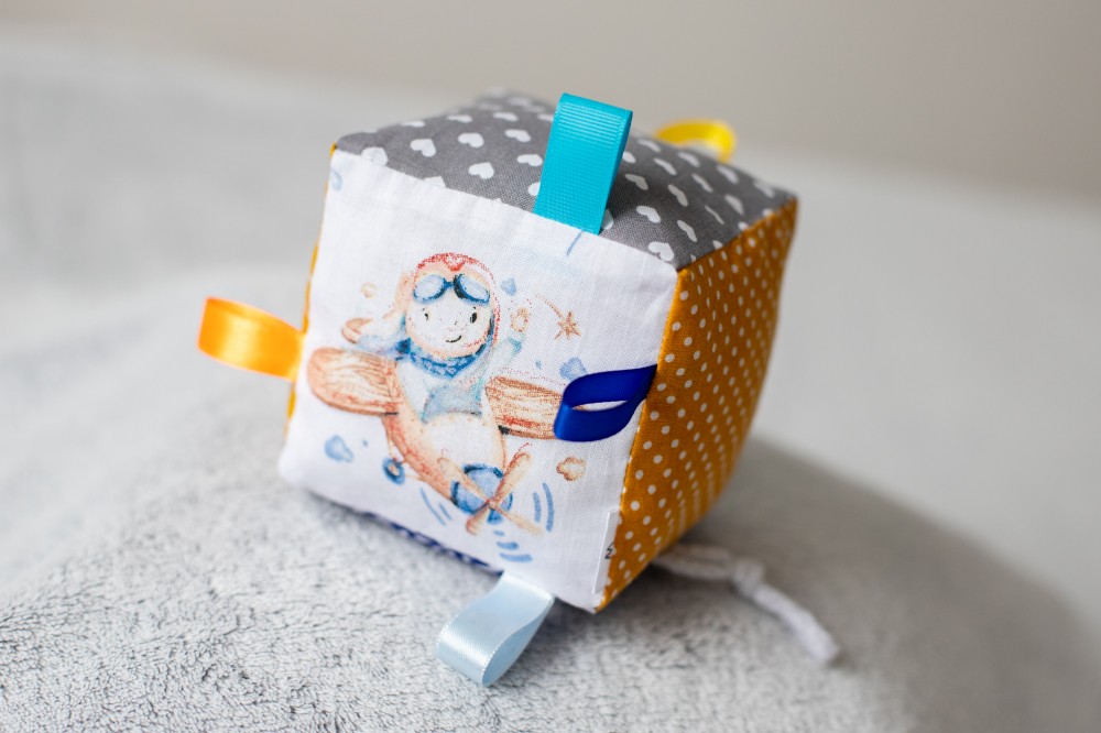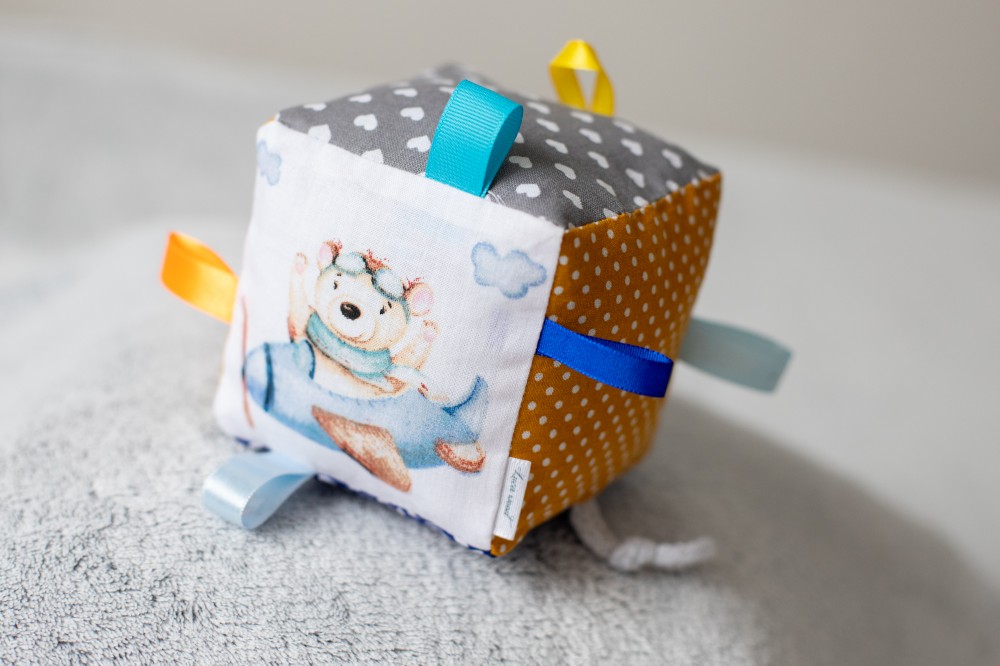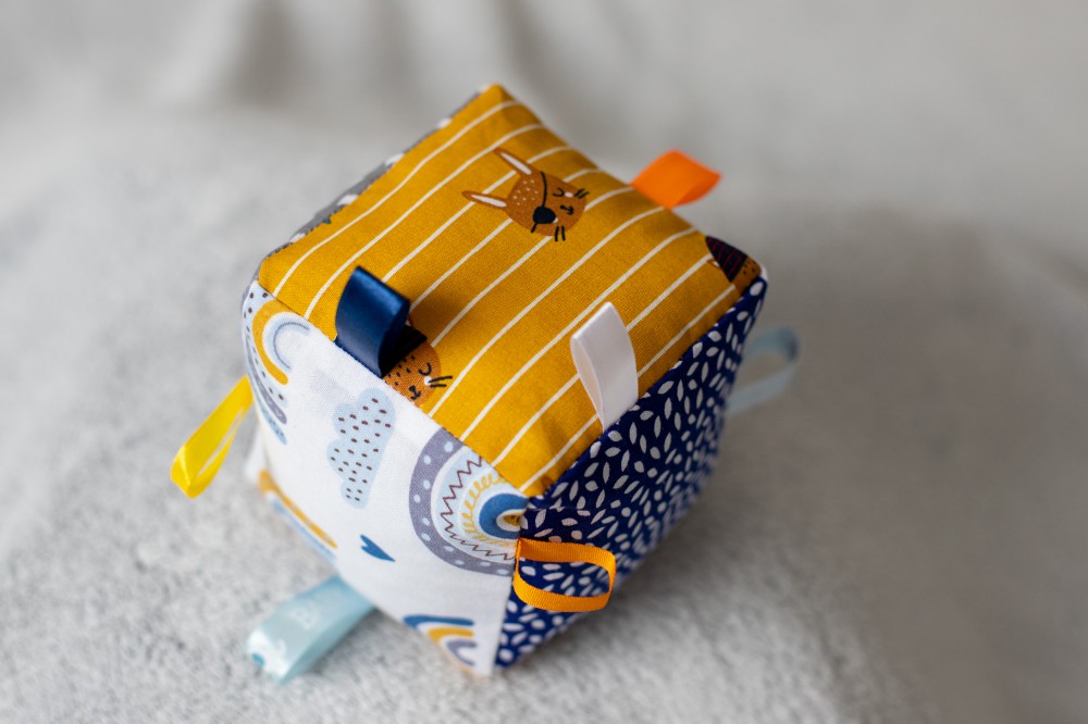 Az kocka széleibe különböző mintájú, anyagú és színű cimkék vannak varrva, melyek igazán lekötik a babák figyelmét. Belsejében halk csörgő található.