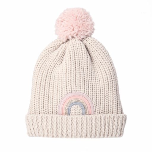 A legálomszerűbb módja annak, hogy melegen maradj ezen a télen... a szivárványos kötött sapkánk gyapjúval bélelt, pom pom-al és lágy színű bársony szivárvánnyal, arany csillámokkal az elején.