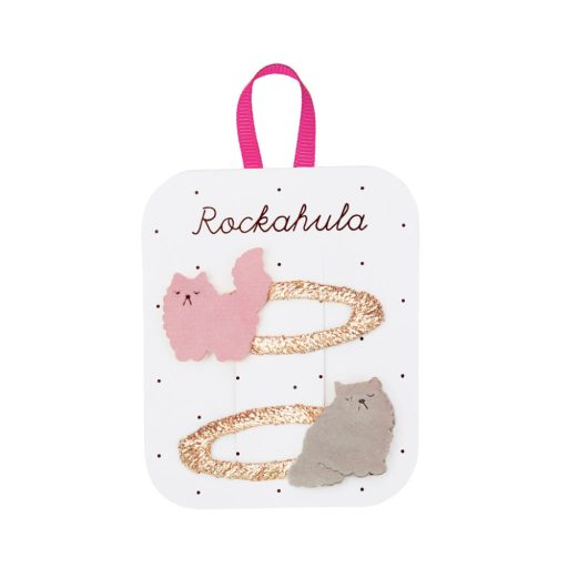 Ez a két cuki hajcsatból álló készlet két aranyos perzsa macskát tartalmaz lágy rózsaszín és szürke színben. Minden macska egy arany csillogó grosgrain-bevonatú csaton ül.